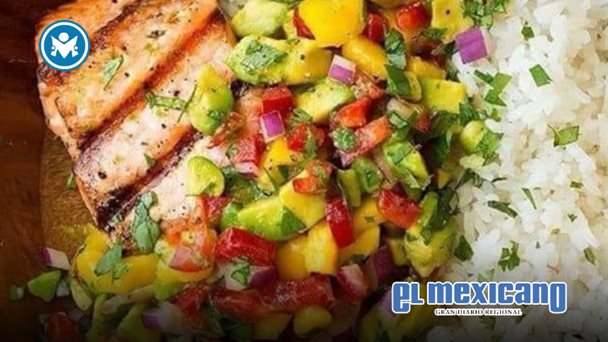 En lo que se calientan los pedazos de pescado, realiza la ensalada, agregando en un tazón, el mango, tomate, la cebolla blanca, chile serrano, cilantro, limón, Sal y aguacate. Mezcla bien los ingredientes