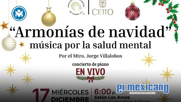 Tijuana, 8 de Diciembre. - El Hospital de Salud Mental de Tijuana A.C. invitó a la comunidad a participar en el concierto de piano "Armonías de Navidad: música por salud mental", que se realizará el próximo miércoles 17 de diciembre en la Casa de la Cultura de Playas de Tijuana a las 18:00 horas.