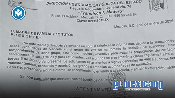Mexicali, 30 de Enero. - Las autoridades educativas de la Escuela Secundaria General No. 76 "Francisco I. Madero" confirmaron este viernes la detección de cuatro casos de varicela entre alumnos de segundo grado, lo que llevó a la suspensión temporal de las clases de ese grupo durante una semana como medida preventiva, en un nuevo episodio de enfermedades contagiosas en centros escolares de México.