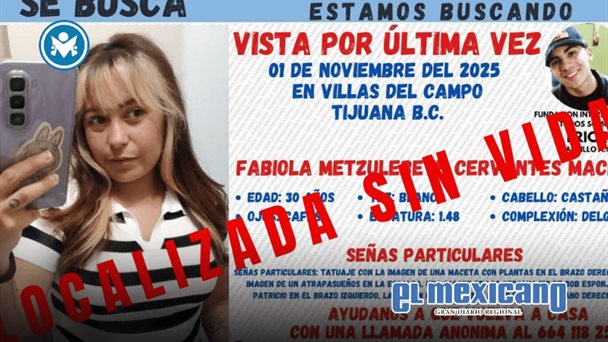 Tijuana, 30 de Noviembre. - Los restos de Fabiola Metzulebeth Cervantes Macías fueron hallados este sábado cerca del Rancho Herradura, en la colonia Villas del Campo, según informó una organización civil de búsqueda. Fabiola desapareció el 1 de noviembre tras salir de su trabajo en una maquiladora de la colonia Tomás Alva Edison, en Tijuana.