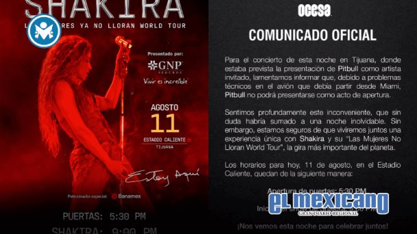 Tijuana, 11 de Agosto. - La cantante colombiana Shakira mantiene su concierto en Tijuana programado para este lunes en el Estadio Caliente, pero anunció que el rapero estadounidense Pitbull ya no participará como artista invitado, informó la promotora Ocesa.