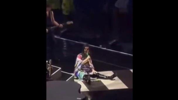 Aparentemente había perdido el equibrio mientras bajaba de la plataforma, pero de manera rápida tras la caída se logró acomodar como si posara tratando de no perder el hilo de la canción, quitándo este accidente, logró concluir la presentación sin mayores complicaciones.