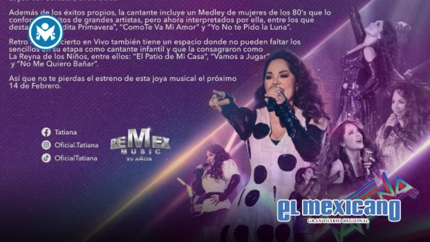 Hablar de la historia musical de Tatiana es hacer referencia a un sinfín de éxitos radiales que la colocaron como una de las cantantes Pop de mayor éxito en los 80's, y recordar cada uno de esos temas en un concierto en vivo no tiene precio.