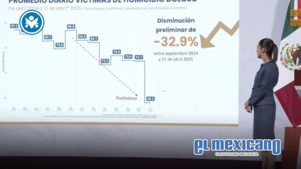 La Presidenta Claudia Sheinbaum Pardo resaltó que, gracias a la implementación de los cuatro ejes de la Estrategia Nacional de Seguridad, ha disminuido en 32.9 por ciento el promedio diario de víctimas de homicidio doloso entre septiembre de 2024 y el 21 de abril de 2025, de acuerdo con datos preliminares.