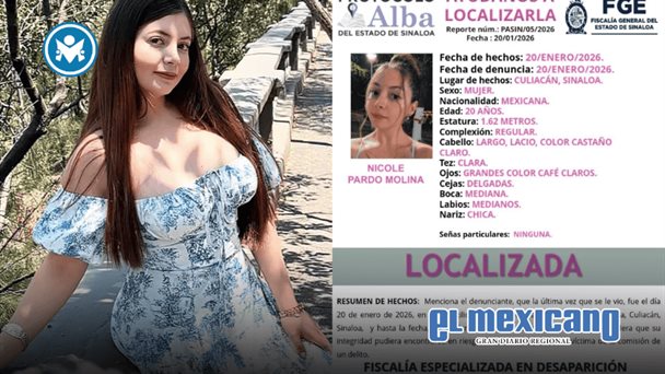 Tijuana, 24 de Enero. - La joven influencer Nicole Pardo Molina, conocida en redes sociales como "La Nicholette", fue localizada con vida luego de haber sido reportada como desaparecida en un presunto secuestro ocurrido el 20 de enero en esta ciudad, informaron autoridades locales.