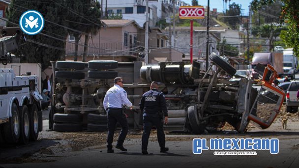 Tijuana, B.C. - Un dompe que transportaba tierra volcó luego de presuntamente sufrir una falla mecánica en los frenos mientras descendía sobre el bulevar 34 Sur con dirección al bulevar Díaz Ordaz, lo que provocó un fuerte accidente que dejó al menos tres personas lesionadas y seis vehículos dañados, algunos con pérdidas totales.
