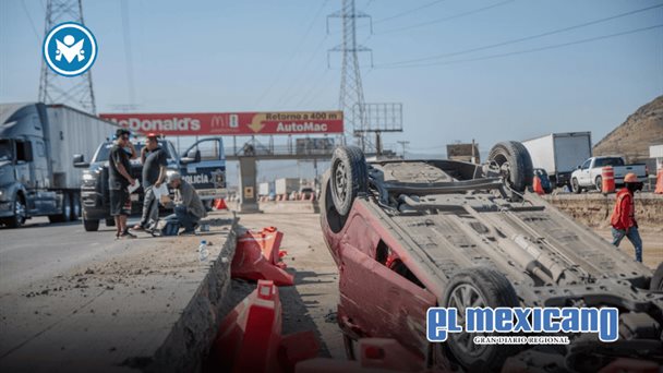El percance involucró a un automóvil Chevrolet Aveo rojo, con placas de Baja California, que terminó volcado dentro de una zona de construcción de carriles confinados, con las llantas hacia arriba.